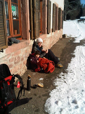 Beschreibung: Kälte umfängt uns, als wir aus dem Auto steigen. Immerhin herrscht Windstille, und die Sonne verleiht der Winterlandschaft einen goldenen Glanz - und uns etwas Wärme. Nach dem Zwiebelprinzip eingepackt machen wir uns auf den Weg. Mia, die am meisten Schichten bekommen hat, kann sich vor lauter Kleidung kaum noch bewegen und entschließt sich schnell für die tragende Variante. Wir folgen dem sonnigen Weg über Wiesen zur Ferme Malplaquet, einem Ensemble aus mehreren Wohnhäusern und Scheunen. Nun geht es leicht ansteigend weiter nach Salm. Salm besteht aus weitläufigen Wiesen, wenigen Häusern und einer Ferme Auberge, die außer Montags und Dienstags immer geöffnet hat. Wer dort essen möchte, sollte vorher einen Tisch reservieren, da der Ort am Wochenende sehr beliebt ist.